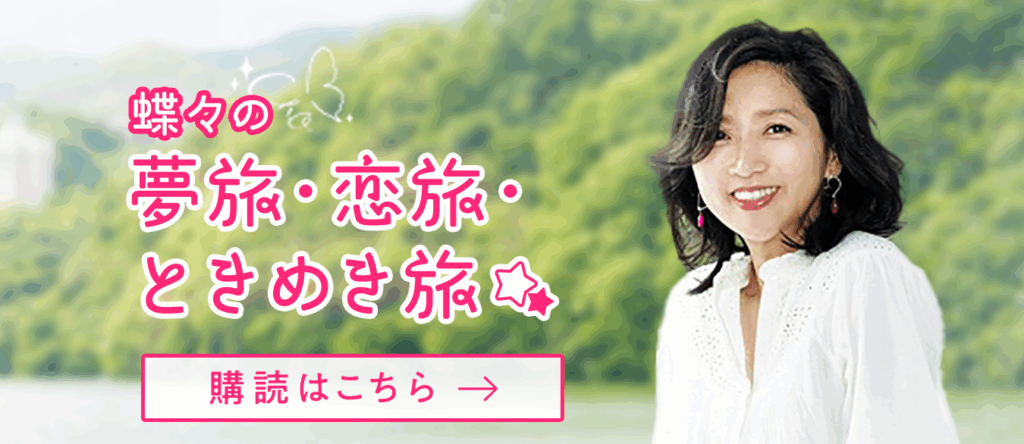 無類の旅好きで、国内から海外まで、息をするように旅しているエッセイスト・蝶々。でもその行先や過ごし方は、普通とはちょっと異なる“エネルギーをチャージするための旅”。 行きやすい観光地からディープな場所まで、パワーチャージできる旅スポットを写真を交えてお伝えします。ここでしか公開できないマル秘スポットも多数掲載。 読むだけでもエネルギーがもらえて元気になれるメルマガです♪ 旅とエネルギーにまつわるQAも受け付けます。